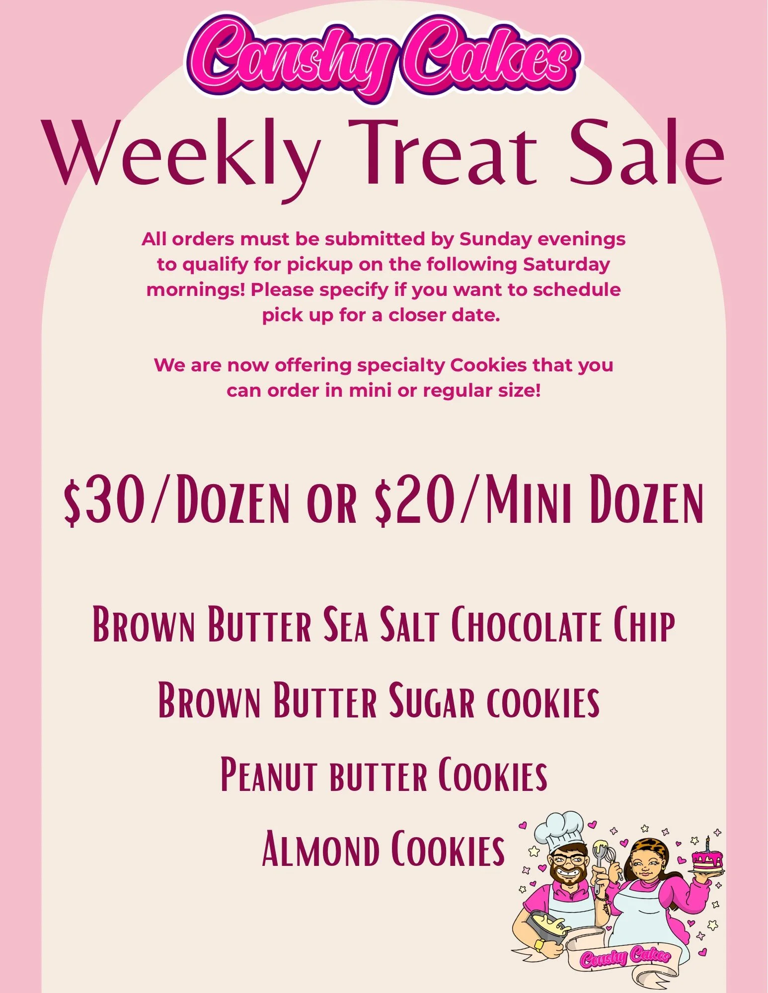 We know we have instructed at least a 2 week notice for all orders, but this allows you, our customers to place an order for whatever treats we are selling that week and pick them up a few days later!